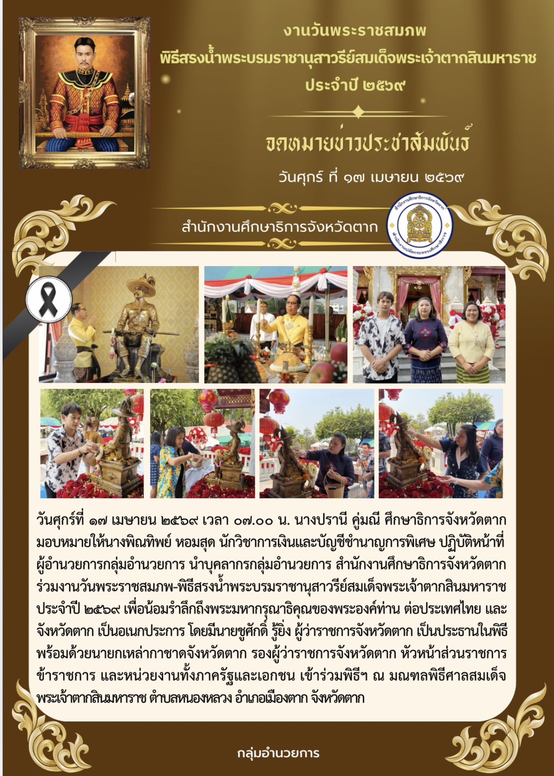 วันอังคารที่ 17 กุมภาพันธ์ 2569 เวลา 07.50 น. ณ หอประชุมกาญจนาภิเษก 1 โรงเรียนตากพิทยาคม อำเภอเมืองตาก จังหวัดตาก