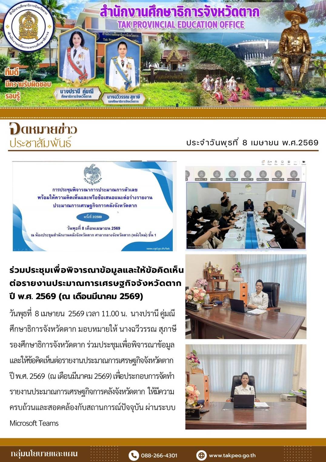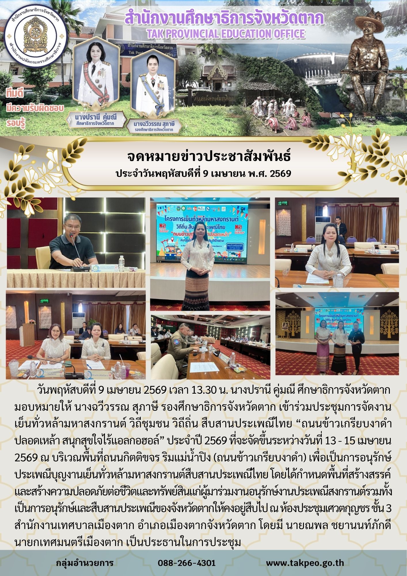 วันอังคารที่ 17 กุมภาพันธ์ 2569 เวลา 09.00 น. ณ ห้องประชุมจามจรี สำนักงานศึกษาธิการจังหวัดตาก อำเภอเมืองตาก จังหวัดตาก