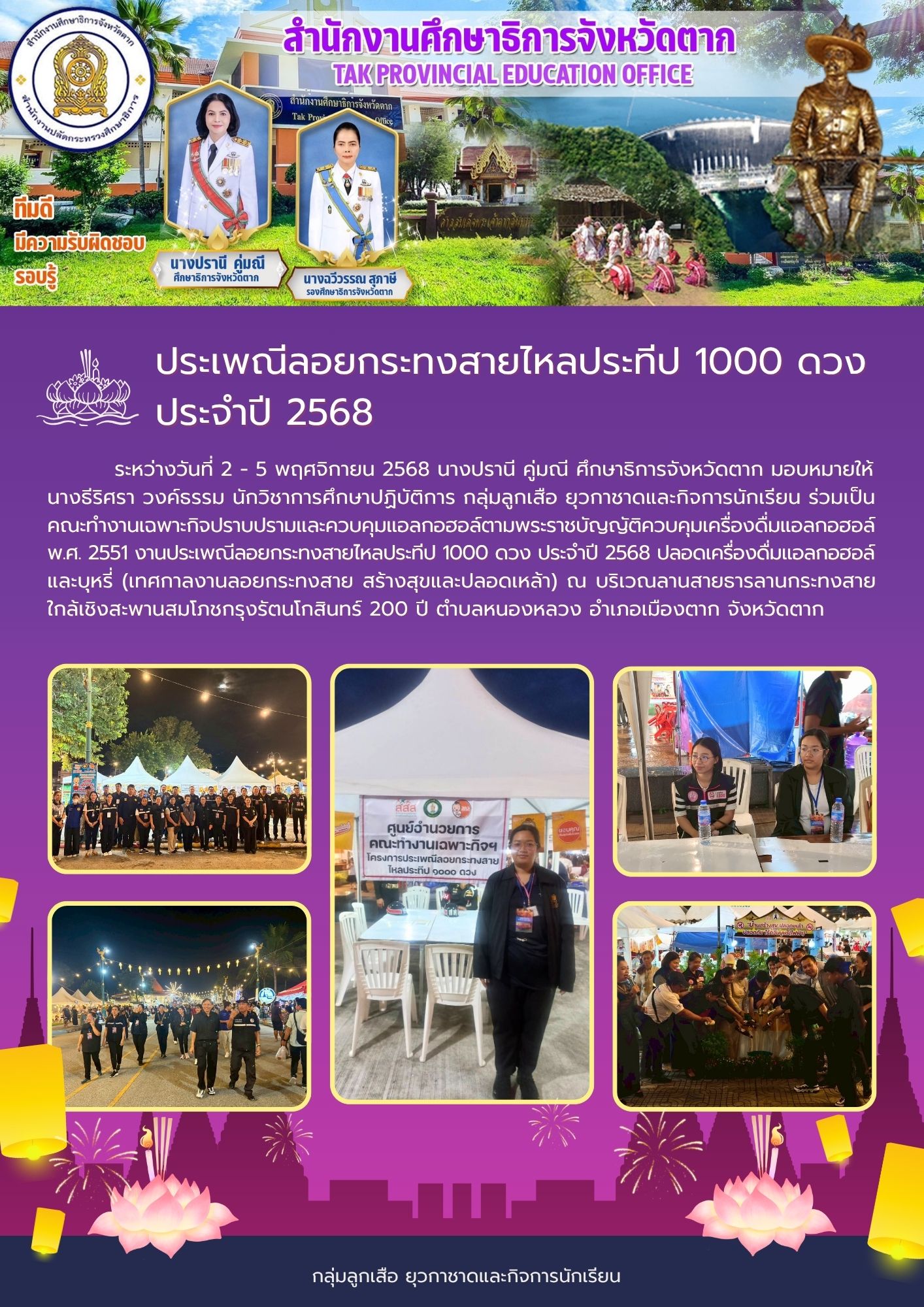 นางปรานี คู่มณี ศึกษาธิการจังหวัดตาก มอบหมายให้นางฉวีวรรณ สุภาษี รองศึกษาธิการจังหวัดตาก เข้าร่วมงาน "เทศกาลกระทงสาย : สายกิน สายดนตรี Food and Music Festival 2025" ภายใต้แนวคิด “ลอยกระทง ไท ไทยคารวาลัย พระแม่ของแผ่นดิน” ในงานประเพณีลอยกระทงสายไหลประทีป 1000 ดวง จังหวัดตาก