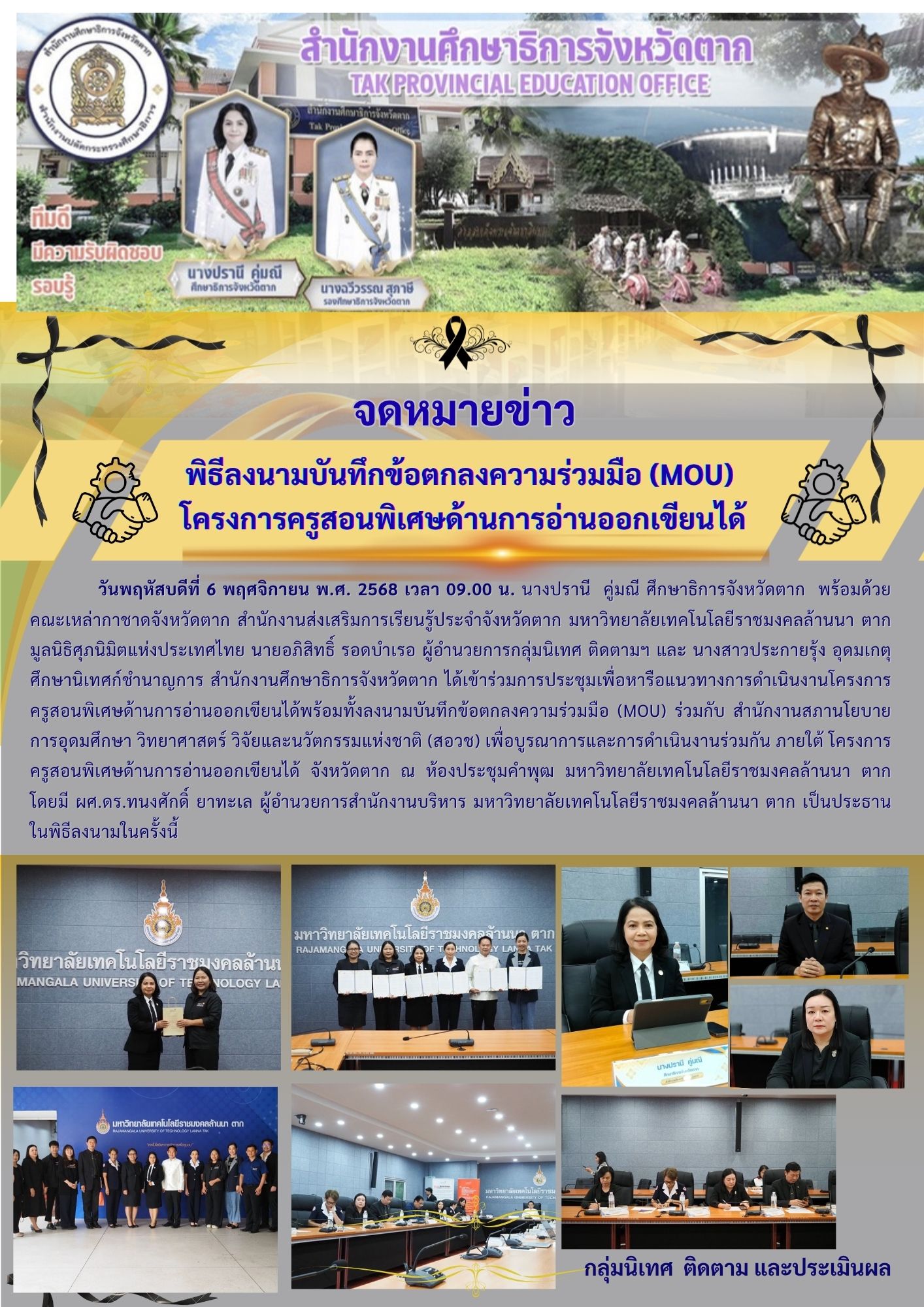 นางปรานี คู่มณี ศึกษาธิการจังหวัดตาก พร้อมด้วย นายอภิสิทธิ์ รอดบำเรอ ผู้อำนวยการกลุ่มนิเทศ ติดตามฯ และ นางสาวประกายรุ้ง อุดมเกตุ ศึกษานิเทศก์ชำนาญการ สำนักงานศึกษาธิการจังหวัดตาก ได้เข้าร่วมการประชุมเพื่อหารือแนวทางการดำเนินงานโครงการครูสอนพิเศษด้านการอ่านออกเขียนได้พร้อมทั้งลงนามบันทึกข้อตกลงความร่วมมือ (MOU) ร่วมกับ สำนักงานสภานโยบาย การอุดมศึกษา วิทยาศาสตร์ วิจัยและนวัตกรรมแห่งชาติ (สอวช) เพื่อบูรณาการและการดำเนินงานร่วมกัน