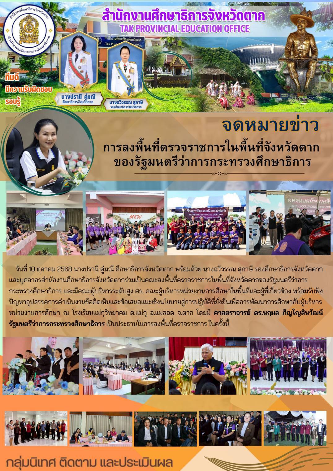 นางปรานี คู่มณี ศึกษาธิการจังหวัดตาก นางฉวีวรรณ สุภาษี รองศึกษาธิการจังหวัดตาก และบุคลากรสำนักงานศึกษาธิการจังหวัดตาก ร่วมต้อนรับ ศ.ดร.นฤมล ภิญโญสินวัฒน์ รัฐมนตรีว่าการกระทรวงศึกษาธิการ ในการร่วมคณะ ร.อ.ธรรมนัส พรหมเผ่า รองนายกรัฐมนตรี ลงพื้นที่อำเภอแม่สอด จังหวัดตาก เพื่อตรวจเยี่ยมการจัดการศึกษาบนพื้นที่สูงและการศึกษาเพื่อการมีงานทำ โดยมี นายสุเทพ แก่งสันเทียะ ปลัดกระทรวงศึกษาธิการ นายพิเชฐ โพธิ์ภักดี เลขาธิการคณะกรรมการการศึกษาขั้นพื้นฐาน และคณะผู้บริหารกระทรวงศึกษาธิการ ร่วมลงพื้นที่ดังกล่าว