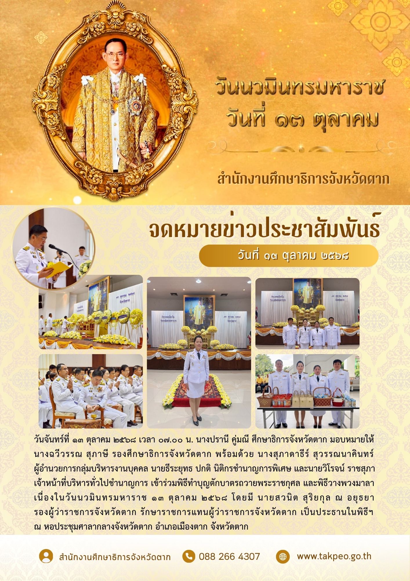 นางปรานี คู่มณี ศึกษาธิการจังหวัดตาก มอบหมายให้ นางธัญญาภรณ์ สิงห์ไฝแก้ว ผู้อำนวยการกลุ่มลูกเสือ ยุวกาชาดและกิจการนักเรียน เข้าร่วมพิธีเจริญพระพุทธมนต์และทำบุญตักบาตรถวายพระราชกุศล (ข้าวสาร อาหารแห้ง) และพิธีมอบประกาศเกียรติคุณแม่ดีเด่นจังหวัดตาก ประจำปี 2568และสตรีไทยดีเด่นจังหวัดตาก ประจำปี 2568 โดยมี นายชูชีพ พงษ์ไชย ผู้ว่าราชการจังหวัดตาก เป็นประธานในพิธีดังกล่าว