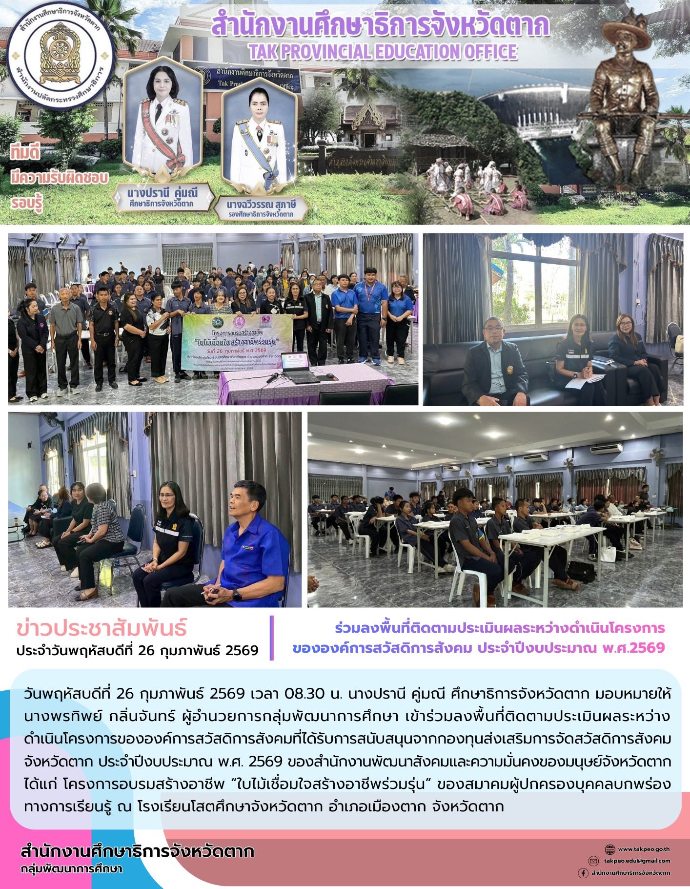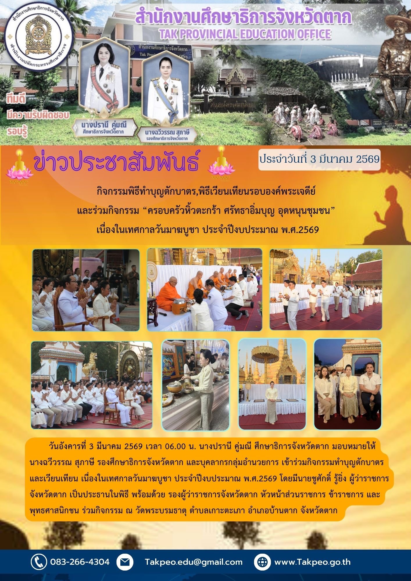 วันอังคารที่ 17 กุมภาพันธ์ 2569 เวลา 07.50 น. ณ หอประชุมกาญจนาภิเษก 1 โรงเรียนตากพิทยาคม อำเภอเมืองตาก จังหวัดตาก