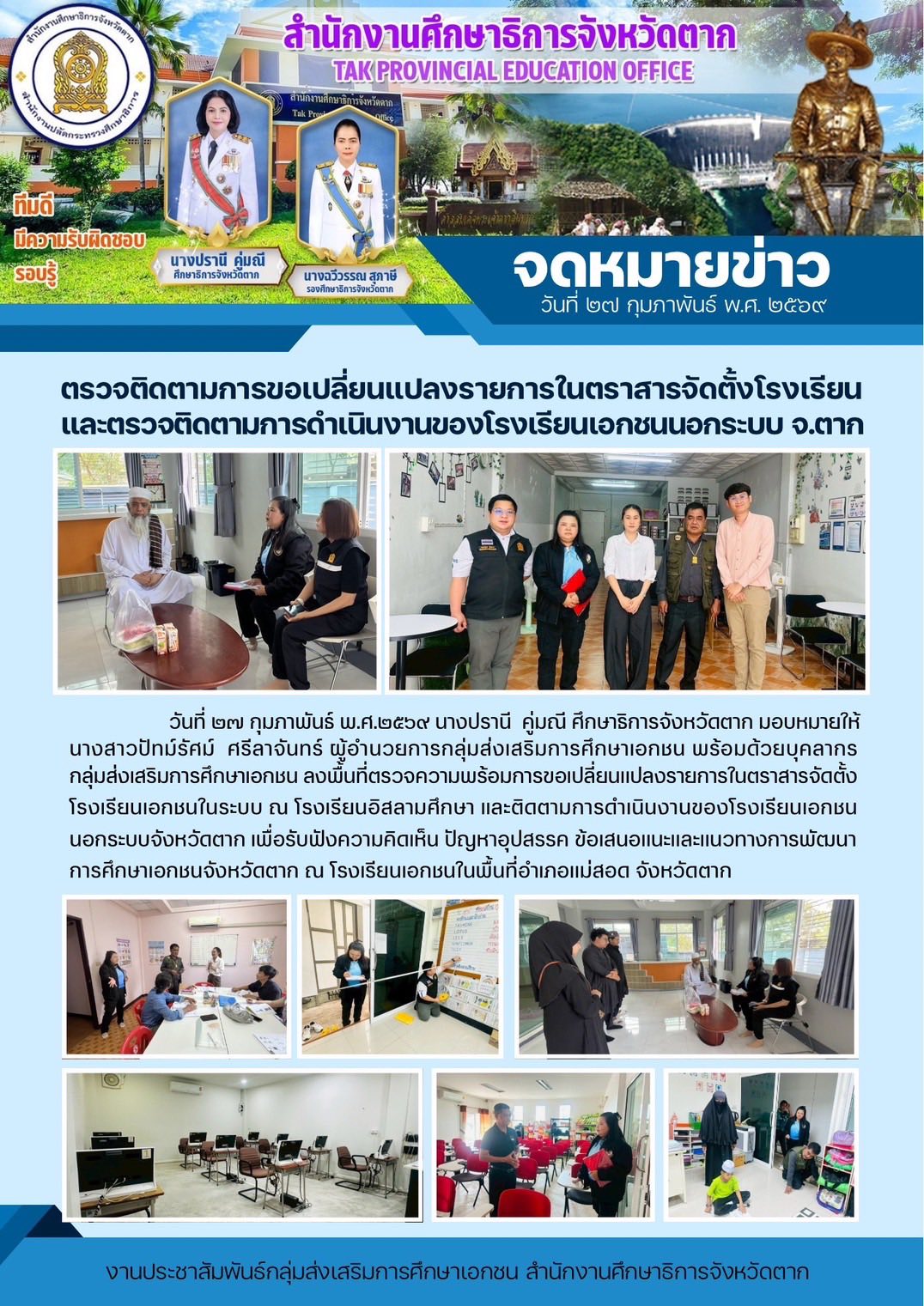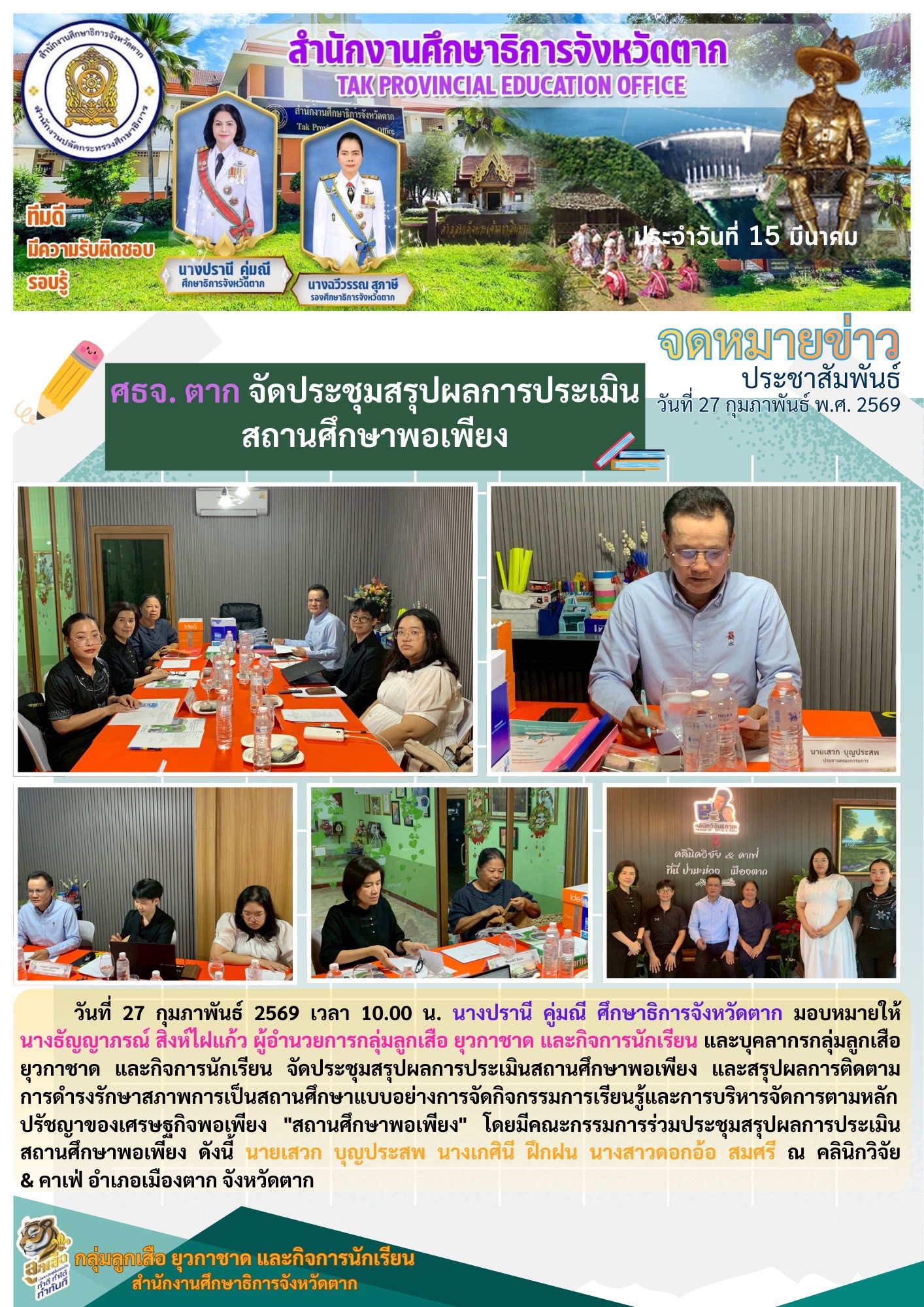 วันอังคารที่ 17 กุมภาพันธ์ 2569 เวลา 09.00 น. ณ ห้องประชุมจามจรี สำนักงานศึกษาธิการจังหวัดตาก อำเภอเมืองตาก จังหวัดตาก