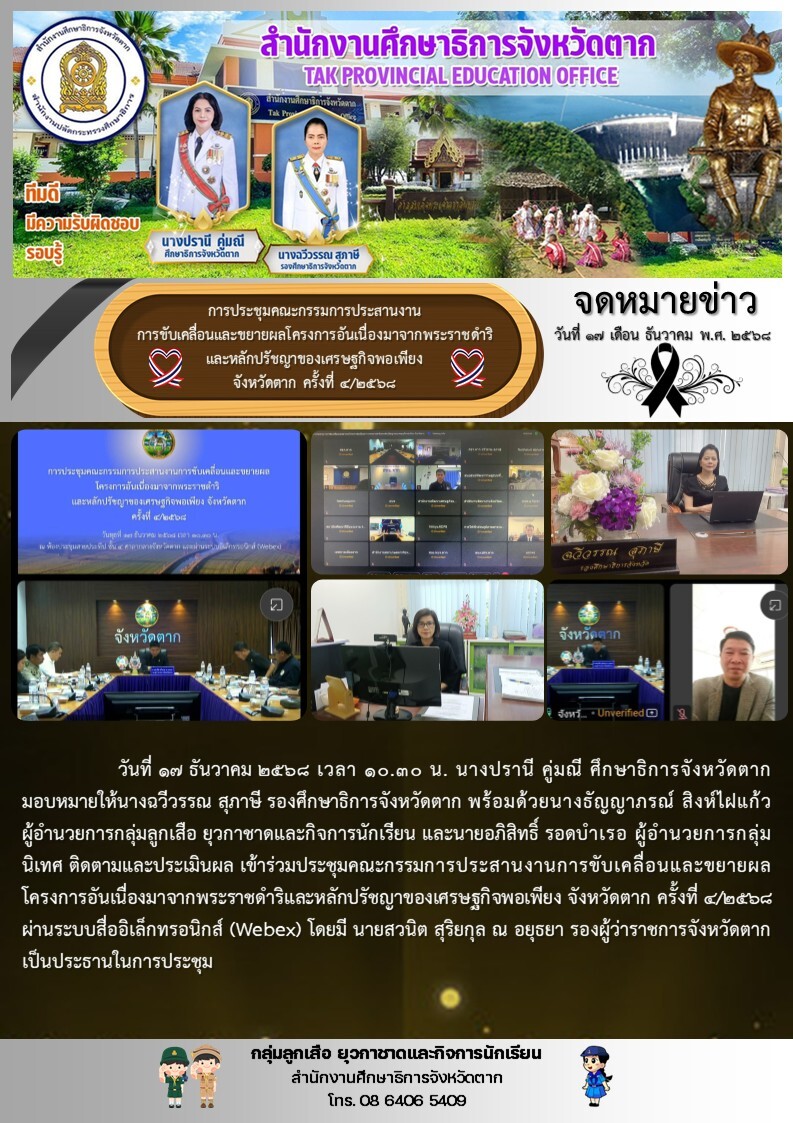 วันพฤหัสบดีที่ 13 พฤศจิกายน 2568 เวลา 09.30 น. ณ ห้องประชุมจามจุรี สำนักงานศึกษาธิการจังหวัดตาก เภอเมืองตาก จังหวัดตาก