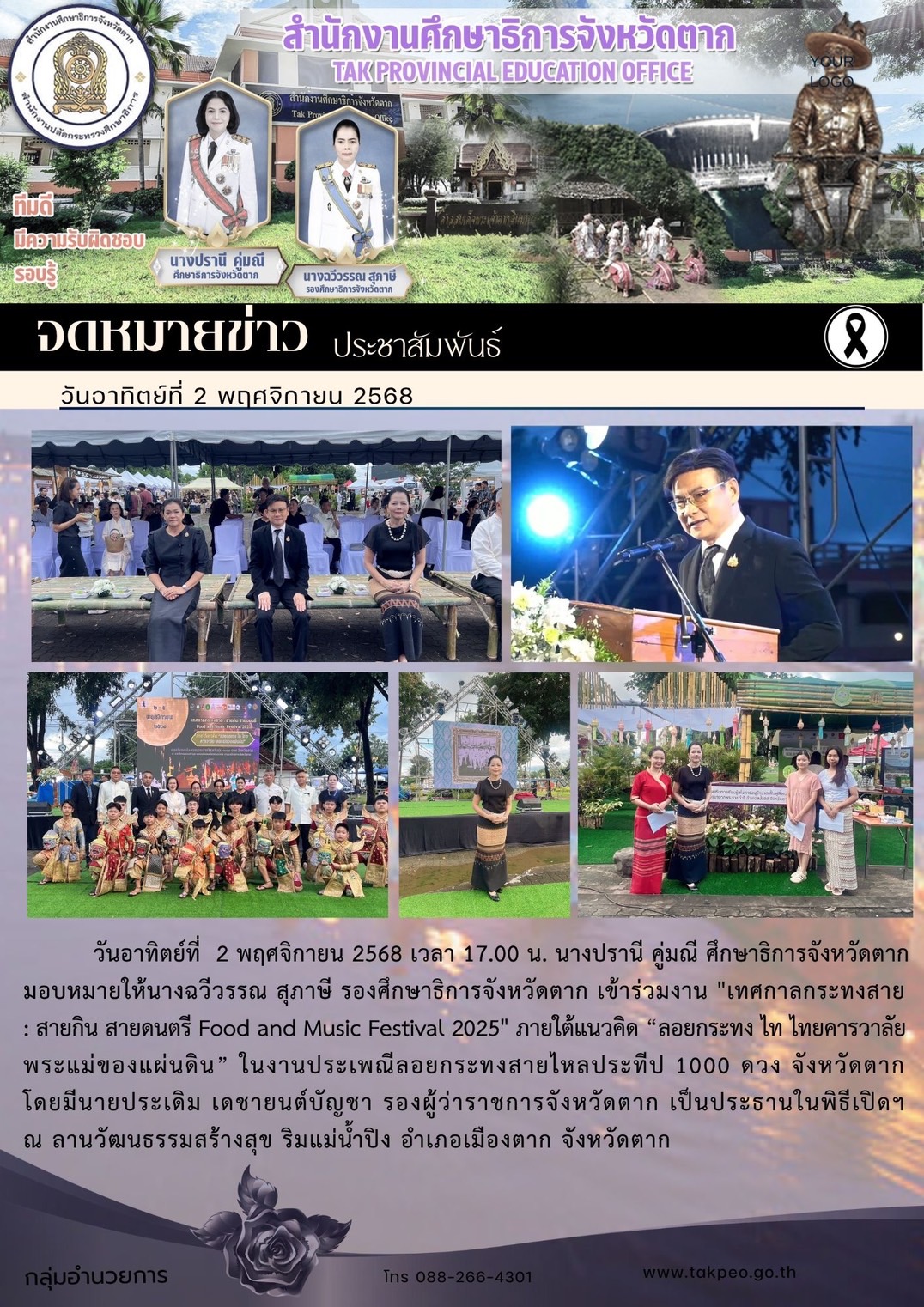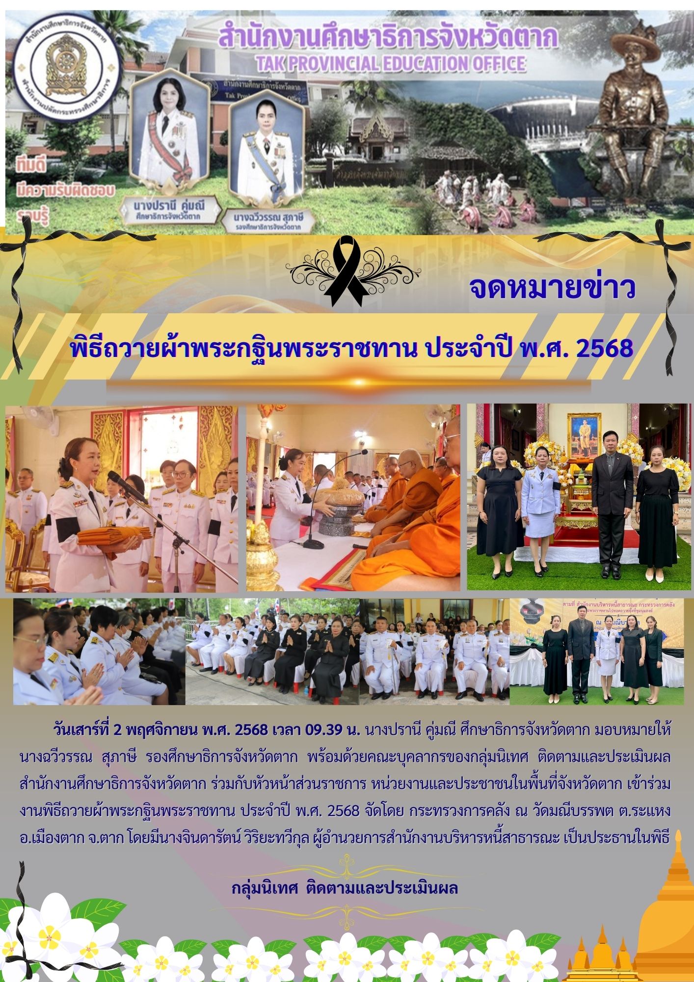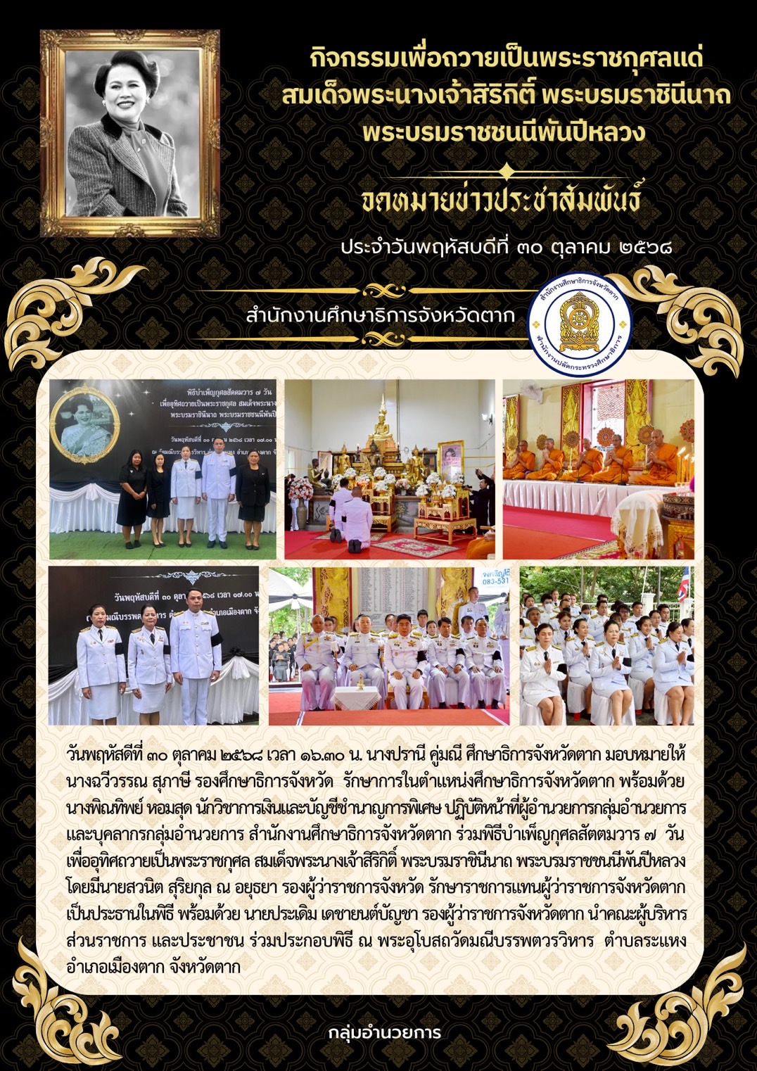 นางปรานี คู่มณี ศึกษาธิการจังหวัดตาก มอบหมายให้ นางธัญญาภรณ์ สิงห์ไฝแก้ว ผู้อำนวยการกลุ่มลูกเสือ ยุวกาชาดและกิจการนักเรียน เข้าร่วมพิธีเจริญพระพุทธมนต์และทำบุญตักบาตรถวายพระราชกุศล (ข้าวสาร อาหารแห้ง) และพิธีมอบประกาศเกียรติคุณแม่ดีเด่นจังหวัดตาก ประจำปี 2568และสตรีไทยดีเด่นจังหวัดตาก ประจำปี 2568 โดยมี นายชูชีพ พงษ์ไชย ผู้ว่าราชการจังหวัดตาก เป็นประธานในพิธีดังกล่าว